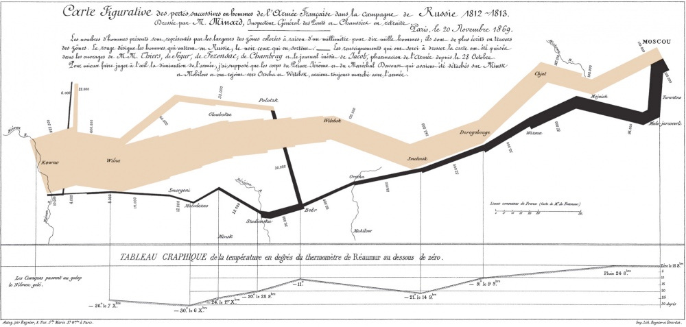 You might have seen this infographic before, considered “the Best Statistical Graphic Ever Drawn”. On the left, in light orange, the map shows the 680,000 troop strength of Napoleon’s march [to the right] into Russia in 1812. French engineer Charles Joseph Minard drew this in 1869, to illustrate the disaster: In black is the size of the retreating force, ever-shrinking as thousands of Napoleon’s soldiers died of disease, cold, starvation and Russian attacks.