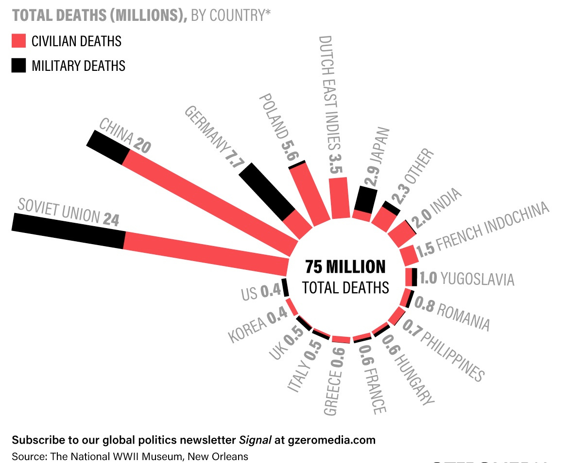 You’ll note that of the 75 million people who lost their lives in World War Two, one third of those were Soviet. The Chinese lost a similar amount: Together, the two countries lost 75% of lives lost by the Allies in total. American deaths pale in comparison, 400,000 or 0.5% of the total.