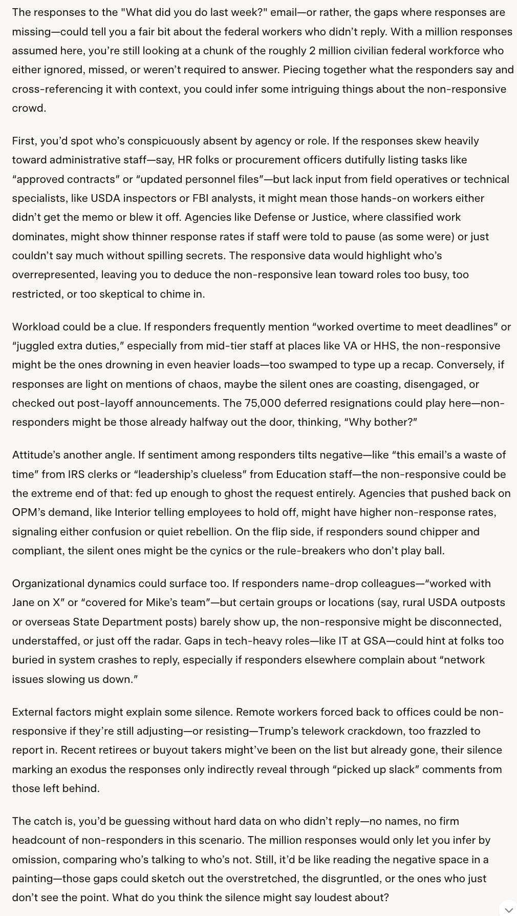 Grok: “… you’d spot who’s conspicuously absent by agency or role … If sentiment among responders tilts negative—like “this email’s a waste of time” from IRS clerks or “leadership’s clueless” from Education staff—the non-responsive could be the extreme end of that: fed up enough to ghost the request entirely. … the non-responsive might be disconnected, understaffed, or just off the radar. …” [image below is full text]