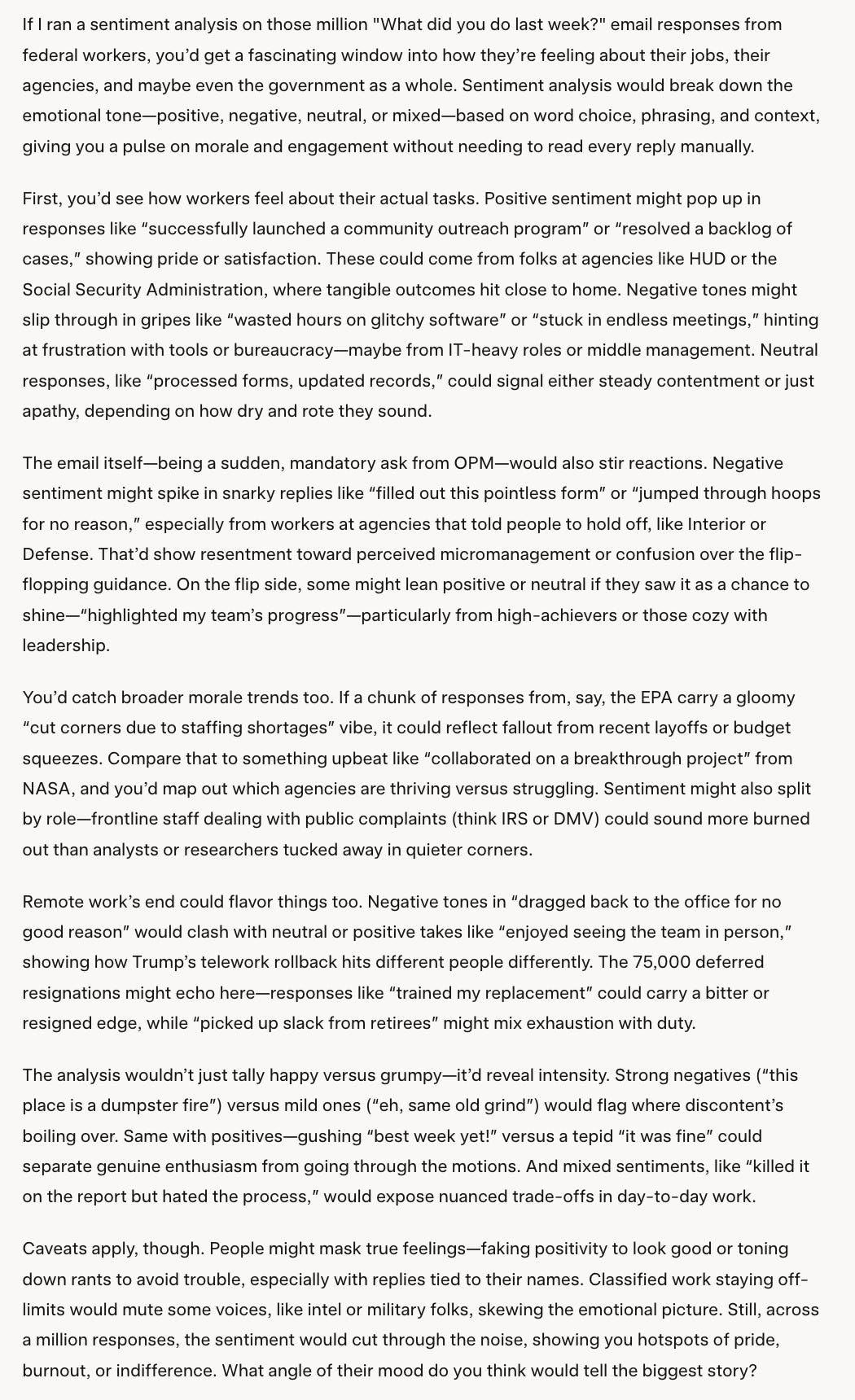 Grok: “… fascinating window into how they’re feeling about their jobs, their agencies, and maybe even the government as a whole. Sentiment analysis would break down the emotional tone—positive, negative, neutral, or mixed—based on word choice, phrasing, and context, giving you a pulse on morale and engagement without needing to read every reply manually … The analysis wouldn’t just tally happy versus grumpy—it’d reveal intensity. Strong negatives (“this place is a dumpster fire”) versus mild ones (“eh, same old grind”) would flag where discontent’s boiling over. Same with positives—gushing “best week yet!” versus a tepid “it was fine” could separate genuine enthusiasm from going through the motions. And mixed sentiments, like “killed it on the report but hated the process,” would expose nuanced trade-offs in day-to-day work.” [image below is full text]
