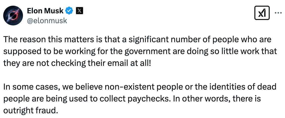 I wrote a post shortly after the election, covering DOGE in some detail. In the post I stated that Trump’s Musk, has something that Kennedy’s McNamara and Reagan’s Grace never had, A MICROPHONE. That is, I said, “They never had a mass-communication media like the one Musk controls.” I argued that Musk and DOGE can both crowdsource solutions and shame the recalcitrant into making changes.