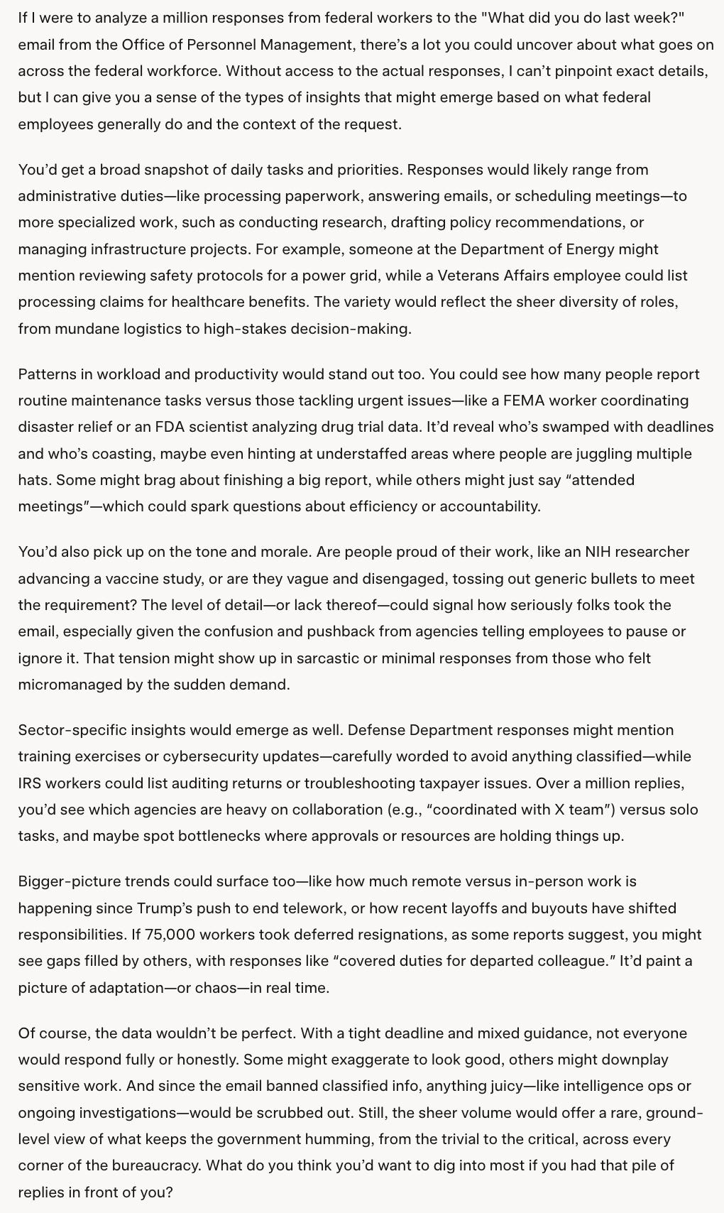 Grok: “You’d get a broad snapshot of daily tasks and priorities. … Patterns in workload and productivity would stand out too. … You’d also pick up on the tone and morale. … Bigger-picture trends could surface too—like how much remote versus in-person work … Of course, the data wouldn’t be perfect. With a tight deadline and mixed guidance, not everyone would respond fully or honestly. Some might exaggerate to look good, others might downplay sensitive work.” [image below is full text]