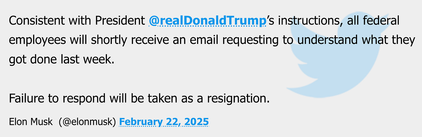 The email has caused quite a stir the past four days. There have been a wide range of responses, including those arguing that it is dumb, that Musk lacks authority, that it breaks protocol, and on and on. Some senior officials instructed their staff not to respond or to wait for further guidance, Kash Patel at F.B.I., for instance.